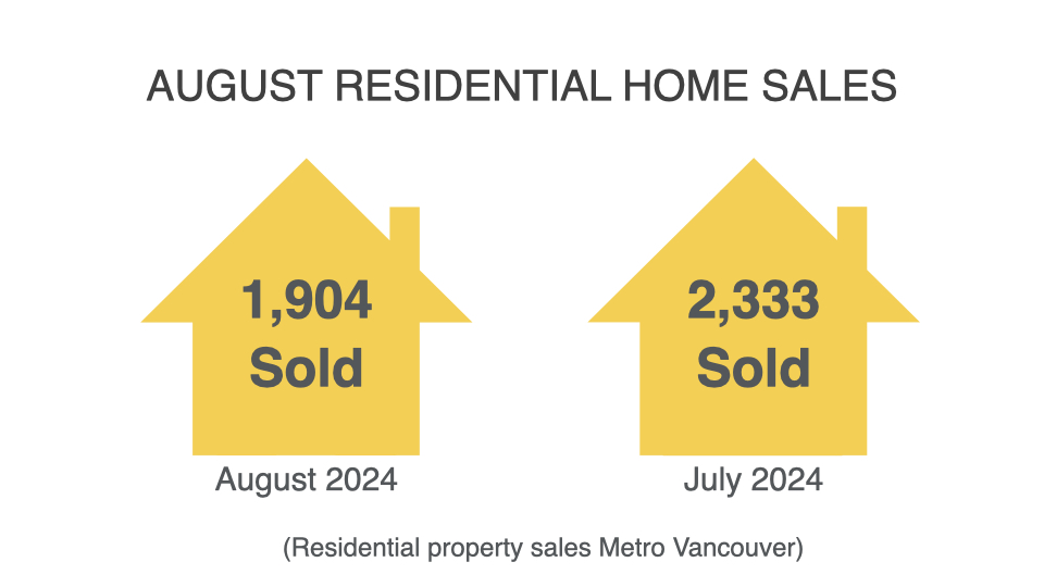 The Greater Vancouver REALTORS® (GVR) reports that residential sales in the region totalled 1,904 in August 2024, a 17.1 per cent decrease from the 2,296 sales recorded in August 2023. This total was also 26 per cent below the 10-year seasonal average (2,572).