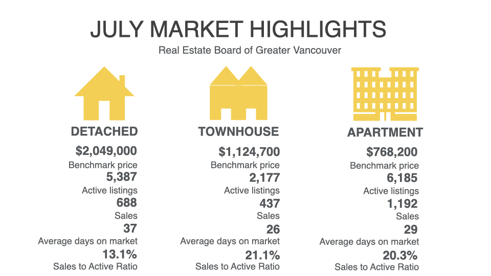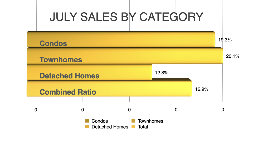 Across all detached, attached and apartment property types, the sales-to-active listings ratio for July 2024 is 16.9 per cent. By property type, the ratio is 12.8 per cent for detached homes, 20.1 per cent for attached, and 19.3 per cent for apartments.