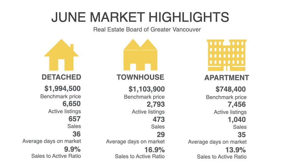 Across all detached, attached and apartment property types, the sales-to-active listings ratio for June 2025 is 12.8 per cent. By property type, the ratio is 9.9 per cent for detached homes, 16.9 per cent for attached, and 13.9 per cent for apartments.