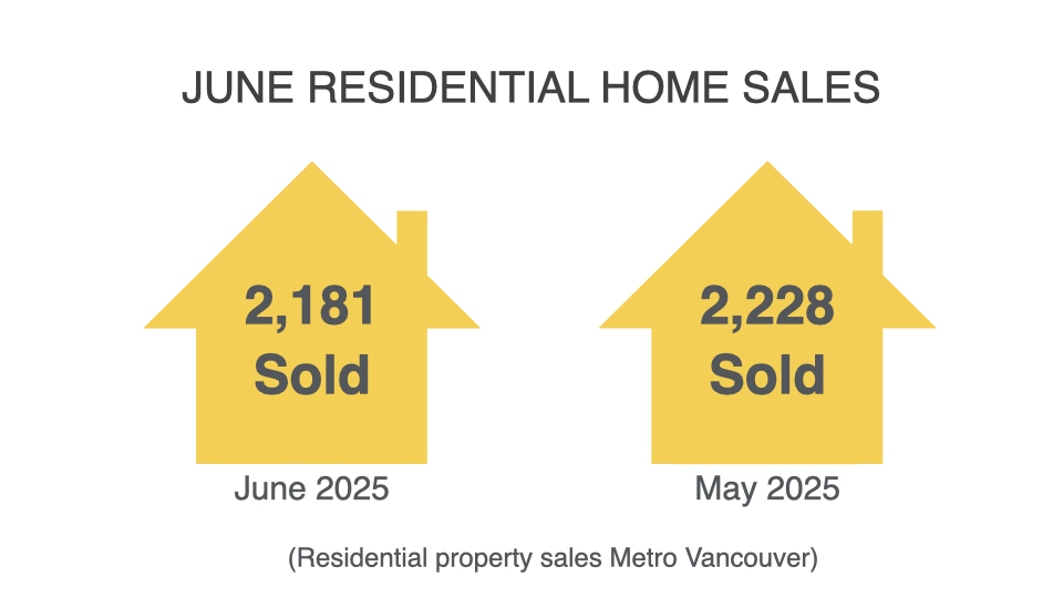 The Greater Vancouver REALTORS® (GVR) reports that residential sales in the region totalled 2,181 in June 2025, a 9.8 per cent decrease from the 2,418 sales recorded in June 2024. This was 25.8 per cent below the 10-year seasonal average (2,940).