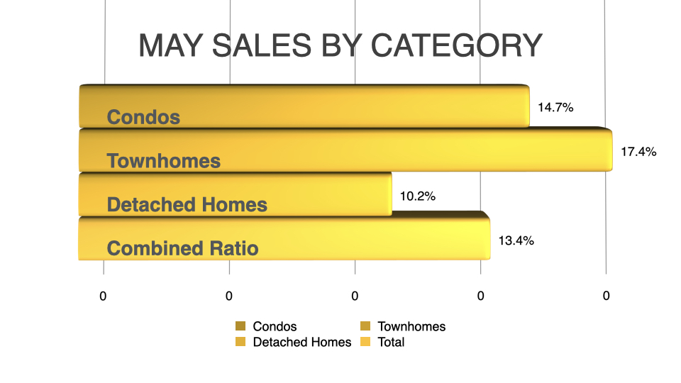 Across all detached, attached and apartment property types, the sales-to-active listings ratio for May 2025 is 13.4 per cent. By property type, the ratio is 10.2 per cent for detached homes, 17.4 per cent for attached, and 14.7 per cent for apartments.
